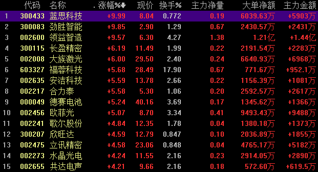 8月14日,消费电子板块全线飘红,截至发稿,蓝思科技、劲胜智能涨停,领益智造涨超9%,长盈精密、大族激光大涨6%,芙蓉科技、合力泰、德赛电池、欧菲光等多股涨超5%。