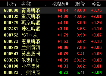 周五早盘,啤酒板块逐渐走强,截至发稿,青岛啤酒大涨超8%,重庆啤酒涨近5%,燕京啤酒、珠江啤酒等跟涨。