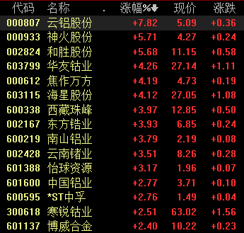 周二早盘,有色金属板块异动拉升,其中,铝业股表现亮眼,截至发稿,云铝股份涨超7%,一度触及涨停,神火股份、和胜股份涨超5%,南山铝业、常铝股份等均有拉升表现。