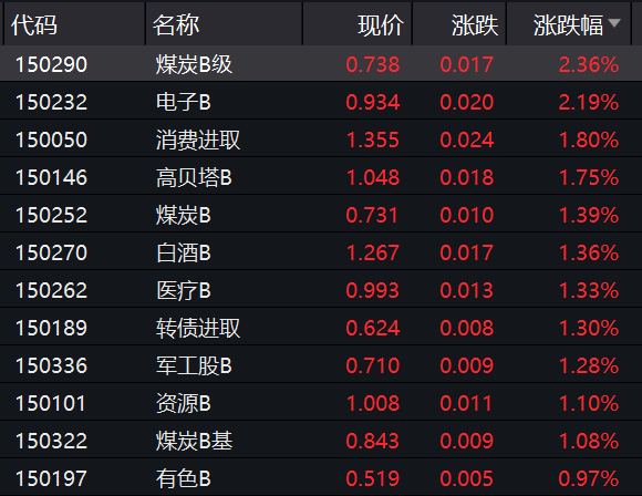 与此同时,地产主题基金也表现不俗,金融地B(150282.SZ)涨8.27%,地产B(150193.SZ)涨幅为0.77%。