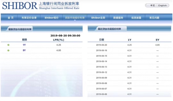 8月20日上午9时30分,新LPR首次报价出炉,1年期报4.25%,5年期报4.85%,低于贷款基准利率,符合市场预期。原1年期和5年以上贷款基准利率分别为4.35%、4.9%,照此计算,新的定价基准较之前分别小幅下降10bp、5bp。
