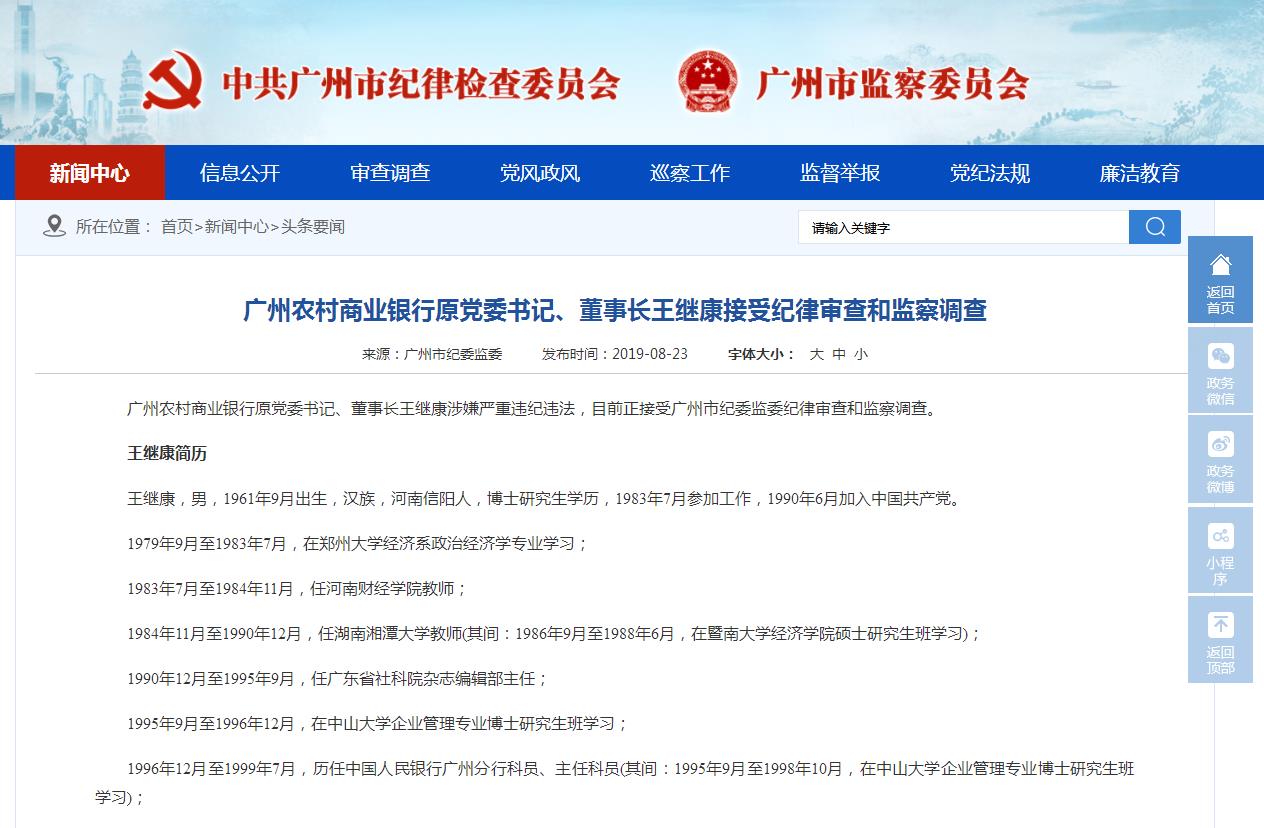 8月23日,广州市纪委监委官网显示,广州农村商业银行(01551.HK)原党委书记、董事长王继康涉嫌严重违纪违法,目前正接受广州市纪委监委纪律审查和监察调查。