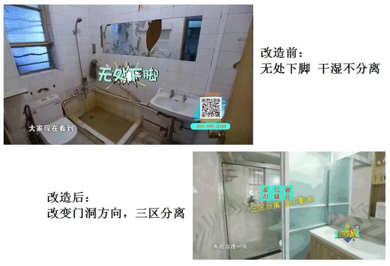 由于原来的卫生间门位与厨房相对,为此设计师改变卫生间门洞位置,形成南北通的形式,让空气更流通;并且实现淋浴、马桶、洗脸台三区分离,拥挤感不复存在。