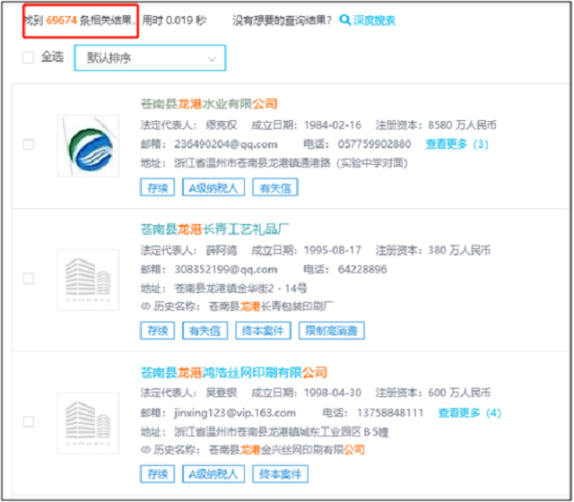 启信宝显示,地处温州苍南的龙港,目前处于存续状态的共有69674家工商实体。