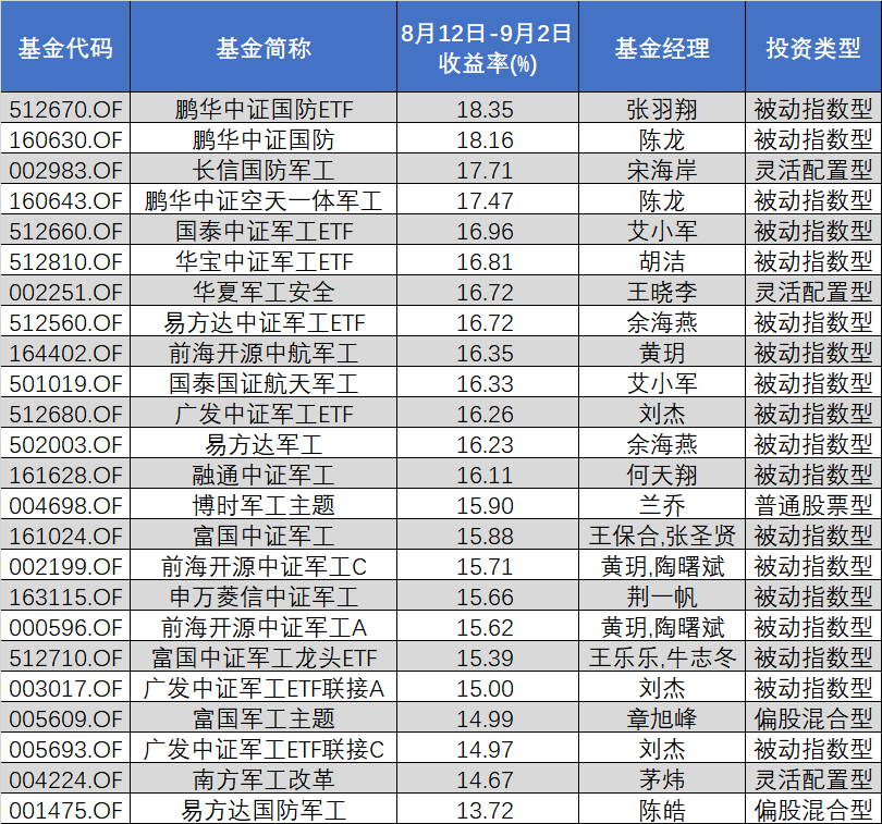 主题基金方面,小编筛选出名称带有“军工”“国防”字眼的产品,发现共有24只(同一基金不同份额分开计算),在这波反弹行情中收益率在13%-19%之间不等,大多数收益率都在15%左右。