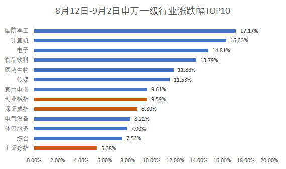 Wind统计显示,从8月12日军工板块开启这波反弹以来,截至9月2日,期间申万国防军工指数累计上涨17.17%。不仅大幅跑赢A股三大指数,而且在所有行业板块中也领涨,连强势的计算机、电子等科技板块,以及食品饮料、医药生物板块也被抛在身后。