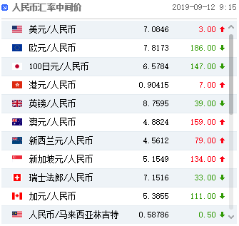 9月12日,人民币兑美元中间价调贬3个基点,报7.0846。 同时,央行公告称,目前银行体系流动性总量处于合理充裕水平,2019年9月12日不开展逆回购操作。今日无逆回购到期,当日实现零投放零回笼。