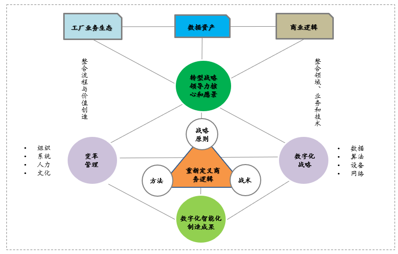 在实践中,我们渐渐摸索出一条制造业向数字化、智能化转型的路径3。这条路径从企业(工厂)的业务生态梳理着手,将数据作为战略资产进行重新考量、找出满足经济-社会-环境发展需求的逻辑;在此基础上提出企业的数字化战略,从数字化进程入手,并引入变革管理的方法论,指导这一升级转型的过程,在重构商务逻辑基础上,以系统的战略、方法和具体措施(接地气的战术)来推进这一进程,对阶段性的数字化智能化成果进行动态的检验。这当中,以可持续发展为目标的战略领导力核心是成功的关键。企业家需要有清晰的社会目标、前瞻的战略愿景、坚强的必胜信念,才能引领企业完成转型,取得面向未来的阶梯式成功。
