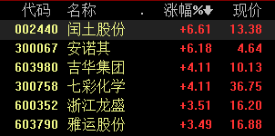 9月17日,分散染料板块早盘走强,闰土股份、安诺其涨逾6%,吉华集团、七彩化学、雅运股份、浙江龙盛等均有拉升。