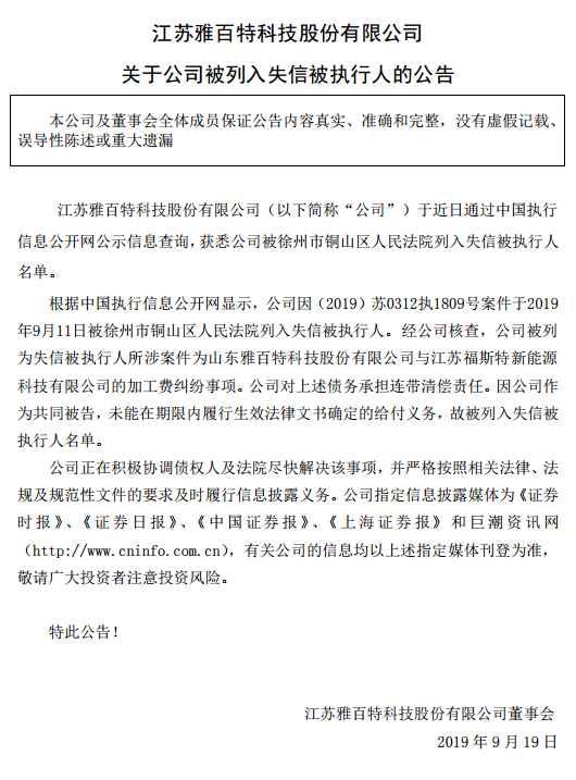 根据公告,经公司核查,公司被列为失信被执行人所涉案件为山东雅百特科技股份有限公司与江苏福斯特新能源科技有限公司的加工费纠纷事项。公司对上述债务承担连带清偿责任。因公司作为共同被告,未能在期限内履行生效法律文书确定的给付义务,故被列入失信被执行人名单。