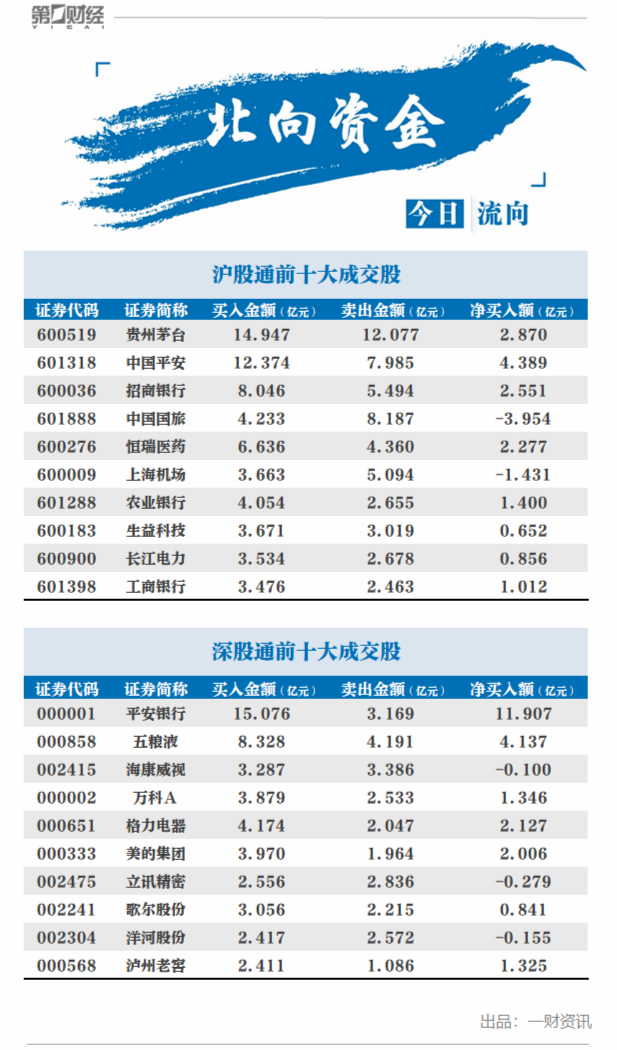 前十大成交股中,北向资金净买入平安银行、中国平安、五粮液金额居前,分别净买入11.91亿元、4.39亿元、4.14亿元。中国国旅净卖出额居首,为3.95亿元。其次是上海机场,为1.43亿元。立讯精密遭净卖出0.28亿元,排行第三。