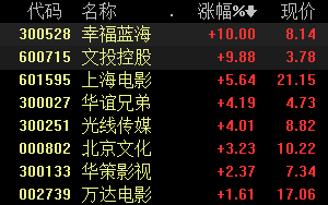 9月23日午后,影视股拉升,截至收盘,幸福蓝海、文投控股涨停,上海电影涨逾5%,华谊兄弟、光线传媒、北京文化、华策影视等多股纷纷跟涨。