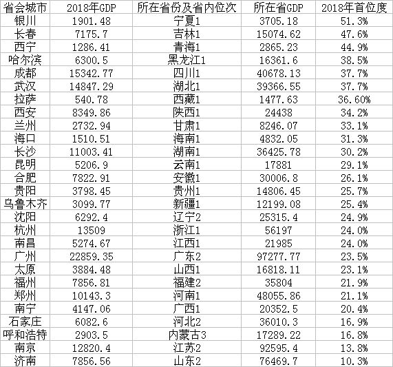 表:各省会城市首位度(GDP:亿元。数据来源:第一财经根据各地统计公报、公开数据梳理)