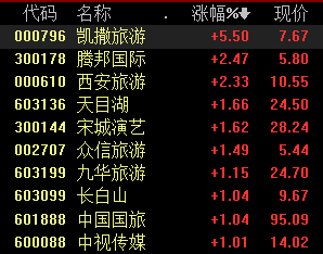 9月26日开盘,受国庆旅游旺季到来等消息的影响,旅游概念股大涨,在线旅游、景点旅游板块涨幅居前,截至发稿,凯撒旅游大涨逾5%,腾邦国际、西安旅游涨超2%,其余个股均有不同程度的拉升。
