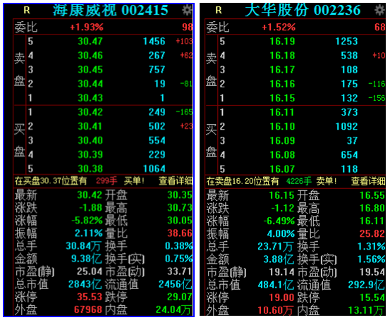 周四早盘,海康威视、大华股份复牌双双低开,截至发稿,海康威视跌5.82%,大华股份跌6.49%。