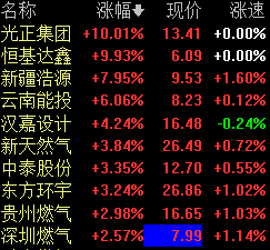 10月15日午盘,天然气板块拉升走强,截至发稿,光正集团、恒基达鑫涨停,新疆浩源涨近8%,云南能投涨超6%,汉嘉设计、新天然气等个股跟涨。