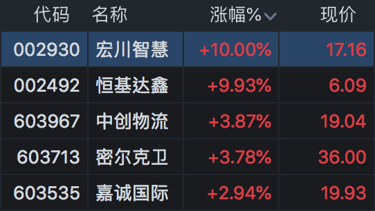 10月、11月进入快递业传统旺季,A股市场上,物流板块也是涨势强劲,10月15日,截至收盘,宏川智慧、恒基达鑫涨停,中创物流、密尔克卫涨超3%,其余个股均有不同程度的拉升。