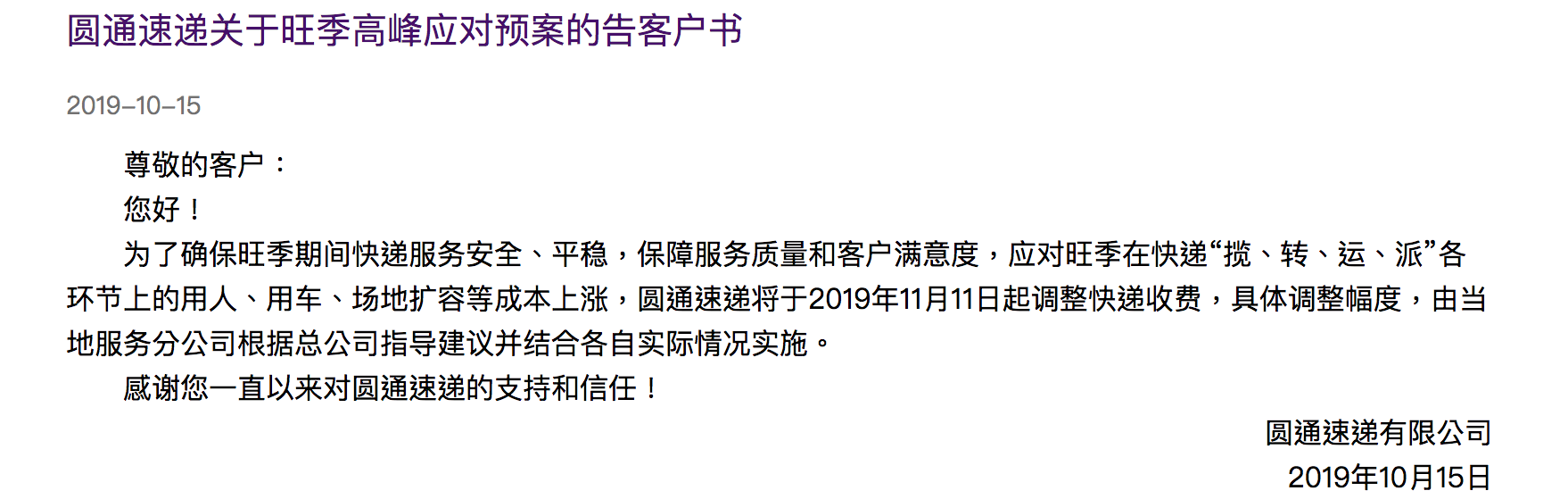 10月15日晚间,圆通速递官网显示,为了确保旺季期间快递服务安全、平稳,保障服务质量和客户满意度,应对旺季在快递“揽、转、运、派”各环节上的用人、用车、场地扩容等成本上涨,圆通速递将于2019年11月11日起调整快递收费,具体调整幅度,由当地服务分公司根据总公司指导建议并结合各自实际情况实施。