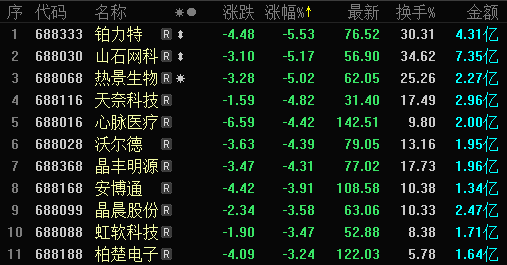 10月24日,两市维持弱势震荡格局,指数全天窄幅波动,创业板小幅收涨。科创板集体调整,截至收盘,仅5支个股飘红。跌幅当面,昨日晚间首发三季报的铂力特(688333.SH)领跌,此外,山石网科(688030.SH)、热景生物(688068.SH)、天奈科技(688116.SH)纷纷跌逾5%,多数个股跟跌;涨幅方面,瀚川智能(688022.SH)、交控科技(688015.SH)等涨幅居前,分别涨2.07%和1.67%。