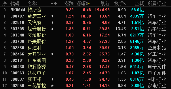 10月24日,特斯拉概念股集体走强,天汽模(002510.SZ)高开秒板,威唐工业(300707.SZ)、星星科技(300256.SZ)等随后涨停,旭升股份(603305.SH)等多只个股跟涨。