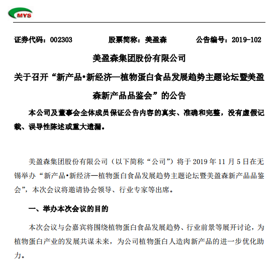 此外,根据公告,美盈森将于2019年11月5日在无锡举办“新产品·新经济—植物蛋白食品发展趋势主题论坛暨美盈森新产品品鉴会”。参与品鉴的产品包括plantmeat牛肉汉堡(牛肉味植物蛋白肉饼)、plantmeat鸡柳(植物蛋白鸡柳)等系列产品。