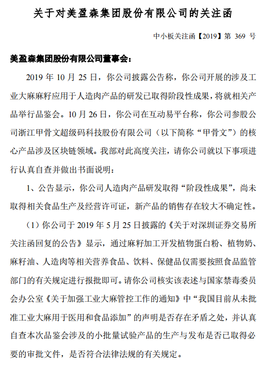 对此,深交所于10月28日晚间下发问询函,要求美盈森说明工业大麻麻籽加工的人造肉产品品鉴会涉及的小批量试验产品的生产与发布是否已取得必要的审批文件;要求美盈森说明关于参股公司浙江甲骨文超级码科技股份有限公司的核心产品涉及区块链领域的具体情况。