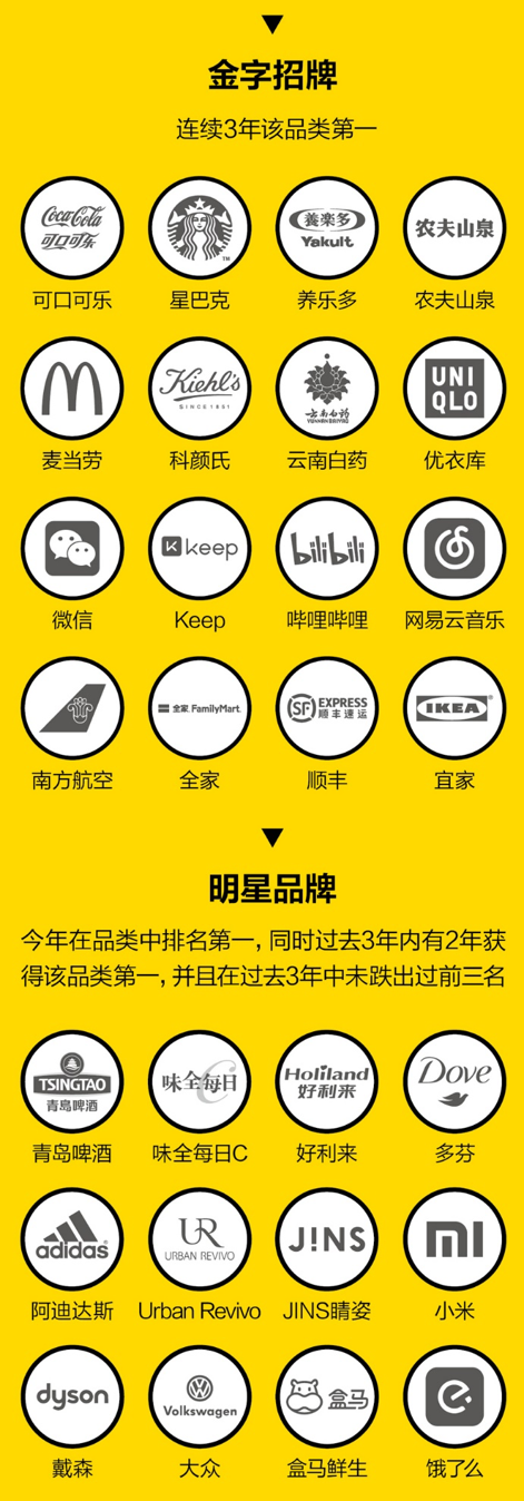 上榜的16个“金字招牌”(按首字母拼音顺序排列)是:哔哩哔哩、Keep、科颜氏、可口可乐、麦当劳、南方航空、农夫山泉、全家、顺丰控股、网易云音乐、微信、星巴克、养乐多、宜家、优衣库、云南白药。