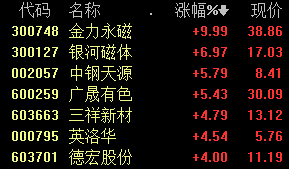 招商证券在此前的研报中指出,稀土镨钕、镝铽主要应用在钕铁硼磁钢。钕铁硼磁材下游主要应用在风电、变频空调、汽车(尤其是新能源汽车)、以及工业机器人电机等。风电逐步复苏,新能源汽车、工业机器人正处于高速增长阶段,都将拉动钕铁硼需求的增长。行业发展有望提速,横店东磁、宁波韵升、中科三环等磁材龙头受关注。
