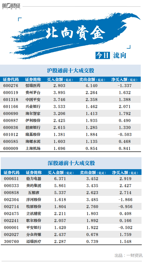 前十大成交股中,净买入额居前三的是格力电器、五粮液、美的集团,分别获北向资金净买入2.92亿元、2.71亿元、2.43亿元。