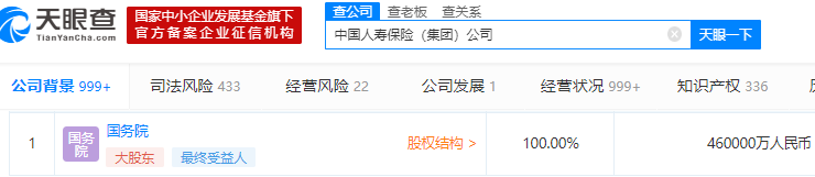 天眼查信息显示,中国人寿保险(集团)公司由财政部100%持股,注册资本46亿元。