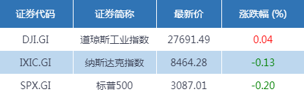 欧美股市涨跌不一,道指涨0.04%,标普、纳指微跌;预计737 MAX将很快恢复商用,波音涨近5%;苹果(AAPL.US)涨约0.8%,续创收盘新高。