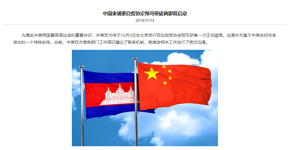 据中国驻柬埔寨王国大使馆14日消息,为落实中柬两国最高层达成的重要共识,中柬双方将于12月3日在北京举行双边自贸协定预可研第一次正式磋商。这是中方基于中柬友好关系做出的一个特殊安排。此前,中柬双方商务部门工作层已建立了联系机制,就推进相关工作进行了密切沟通。