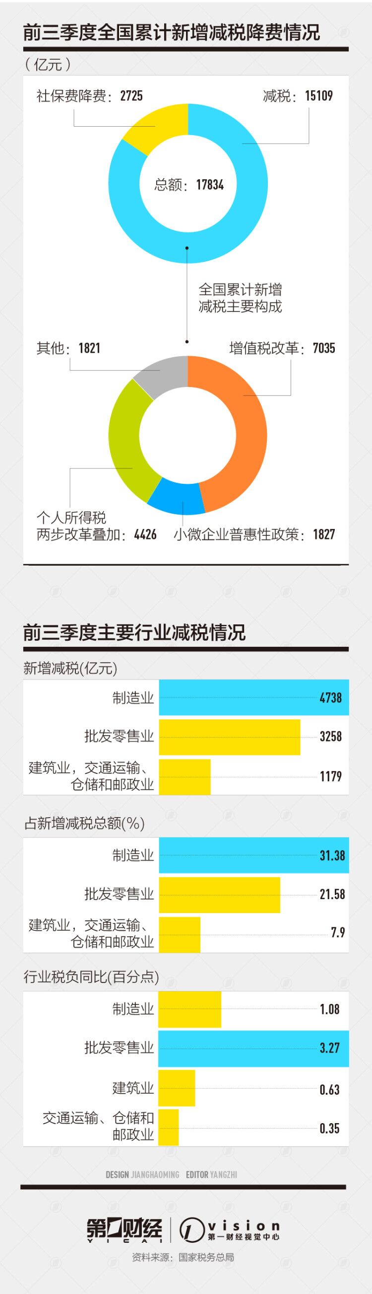 国家税务总局数据显示,今年前三季度,全国累计新增减税降费17834亿元,其中新增减税15109亿元,新增社保费降费2725亿元。新增减税主要包括增值税改革新增减税7035亿元,小微企业普惠性政策新增减税1827亿元,个人所得税两步改革叠加新增减税4426亿元。