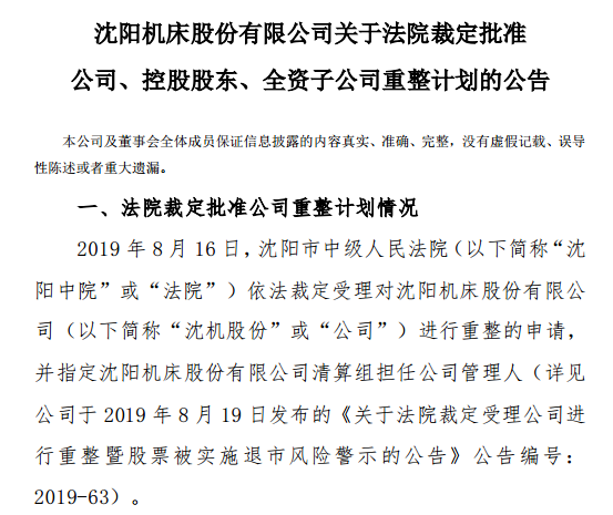 根据公告,沈阳市中级人民法院认为,《沈阳机床股份有限公司重整计划草案》表决程序合法、有效,重整计划内容完备,经营方案具有可行性, 符合《企业破产法》的规定。依据规定,裁定: 批准《沈阳机床股份有限公司重整计划》,终止沈机股份重整程序。