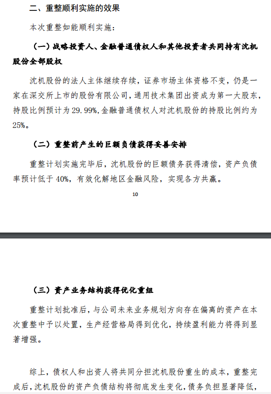 *ST沈机表示,重整计划实施完毕后,沈机股份的巨额债务获得清偿,资产负债率预计低于 40%,有效化解地区金融风险,实现各方共赢。