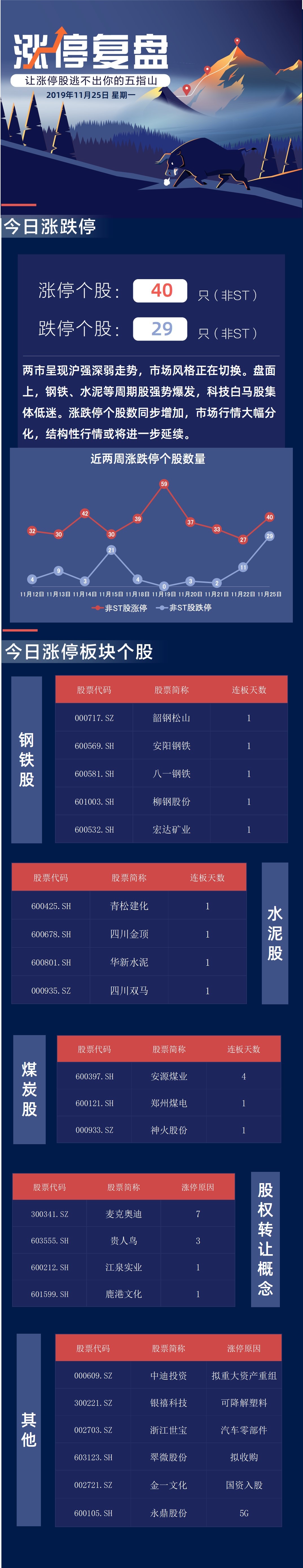 11月25日,两市呈现“沪强深弱”走势,钢铁、煤炭、水泥等强周期板块“王者归来”,而科技白马股却“节节败退”集体跳水,面对变幻莫测的市场风格切换,今日又有哪些涨停股浮现出了水面?