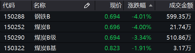 而另一边,钢铁、煤炭板块的表现则不尽人意,钢铁B、煤炭B)均跌4%,煤炭B级跌超3%,煤炭B基、钢铁分级均收跌。