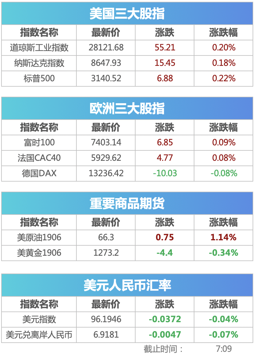 周二美国三大股指续创收盘历史新高,截至收盘,道指涨55.21点,涨幅0.20%,报28121.68点。纳指涨15.44点,涨幅0.18%,报8647.93点。标普500指数涨6.88点,涨幅0.22%,报3140.52点。默克集团涨近2%,宝洁涨1.45%,领涨道指成分股。科技股涨跌不一,苹果跌0.78%,亚马逊涨1.3%,特斯拉跌超2%。此外,由于三季度营收增速持续下滑,中概股陌陌跌超6%。
