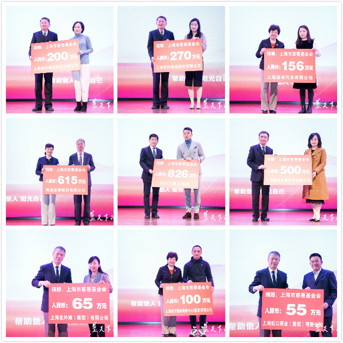 开幕式上,爱心企业分别向上海市慈善基金会捐赠善款,用于慈善公益事业。SGCU爱心联盟捐赠826万元、海通证券股份有限公司捐赠615万元、上海晨光文具股份有限公司捐赠500万元、上海农村商业股份有限公司捐赠270万元、上海柘中集团股份有限公司捐赠200万元、上海蔚来汽车有限公司捐赠156万元、上海南方国际购物中心(集团)有限公司捐赠100万元、上海北外滩(集团)有限公司捐赠65万元、上海虹口商业(集团)有限公司捐赠55万元、上海虹房(集团)有限公司捐赠50万元。