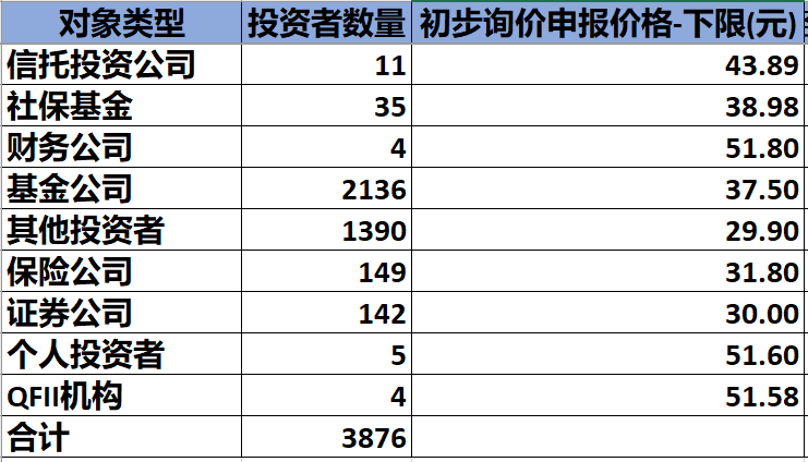 证券公司出的初步询价申报价格下限为30元每股,保险公司给出了31.8元每股的报价,而其他投资者一栏则报出低于30元每股的报价,较最终定价下浮40.8%。另外,在4035个配售对象中,有304个配售对象申报价格低于40元。