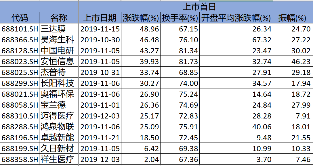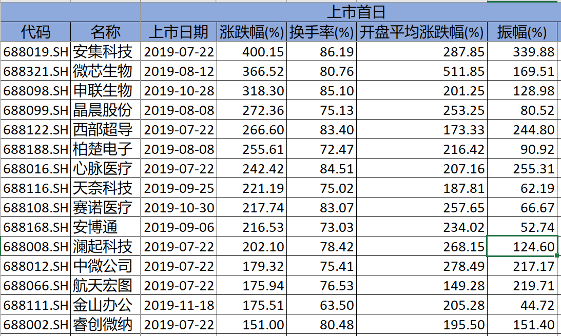 2019年7月22日,首批25家科创板上市平均收盘价为70.06元,平均涨幅为140%,涨幅最高的为安集科技(688019.SH)400.15%,涨幅最低的新光光电(688011.SH)也有84.22%的单日收益。