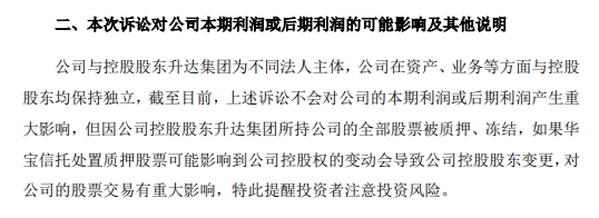 据公告,法院判决若升达集团不履行还款义务,华宝信托有权以拍卖、变卖上述质押财产所得的价款优先受偿。*ST升达表示,截至目前,上述诉讼不会对公司的本期利润或后期利润产生重大影响,但因公司控股股东升达集团所持公司的全部股票被质押、冻结,如果华宝信托处置质押股票可能影响到公司控股权的变动会导致公司控股股东变更,对公司的股票交易有重大影响。
