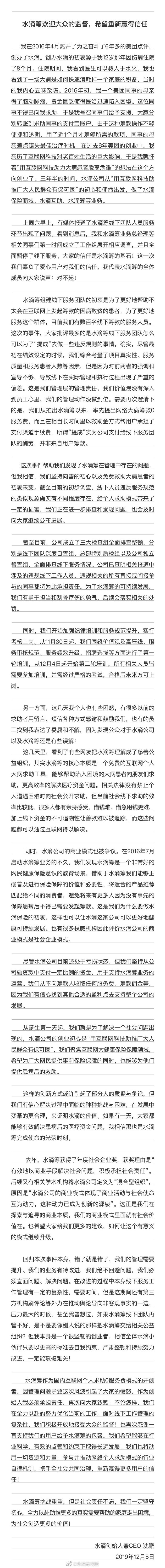 沈鹏说,上周六,有媒体报道了水滴筹线下团队人员服务环节出现了问题。看到消息后,水滴筹第一时间成立了工作组展开相应调查,并且全面暂停了线下服务。“大家的信任是水滴筹的基石!这一次我们辜负了爱心用户对我们的信任,我代表水滴筹的全体成员向大家说声:对不起!”