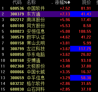 12月9日,网络安全概念股震荡拉升,中国软件、东方通一度涨停,截至发稿,中国软件、东方通涨7%,南洋股份、同方股份等涨5%,数字认证涨4%,常山北明、安博通、太极股份等跟涨。