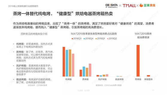 CBNData x天猫x豆果美食《2019年线上烘焙电器行业线上趋势报告》数据显示,70前的“银发群体”对健康烘焙尤为关注,成为蒸烤箱的主要消费群体之一;