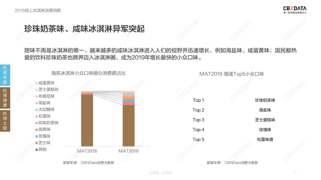 而近年来,新口味撑起一个新品牌的案例更是屡见不鲜。以冰淇淋为例,CBNData《2019线上冰淇淋消费洞察》发现,2019年线上冰淇淋增速最快的小众口味依次是:珍珠奶茶、海盐、芝士蛋糕、玫瑰和松露口味。