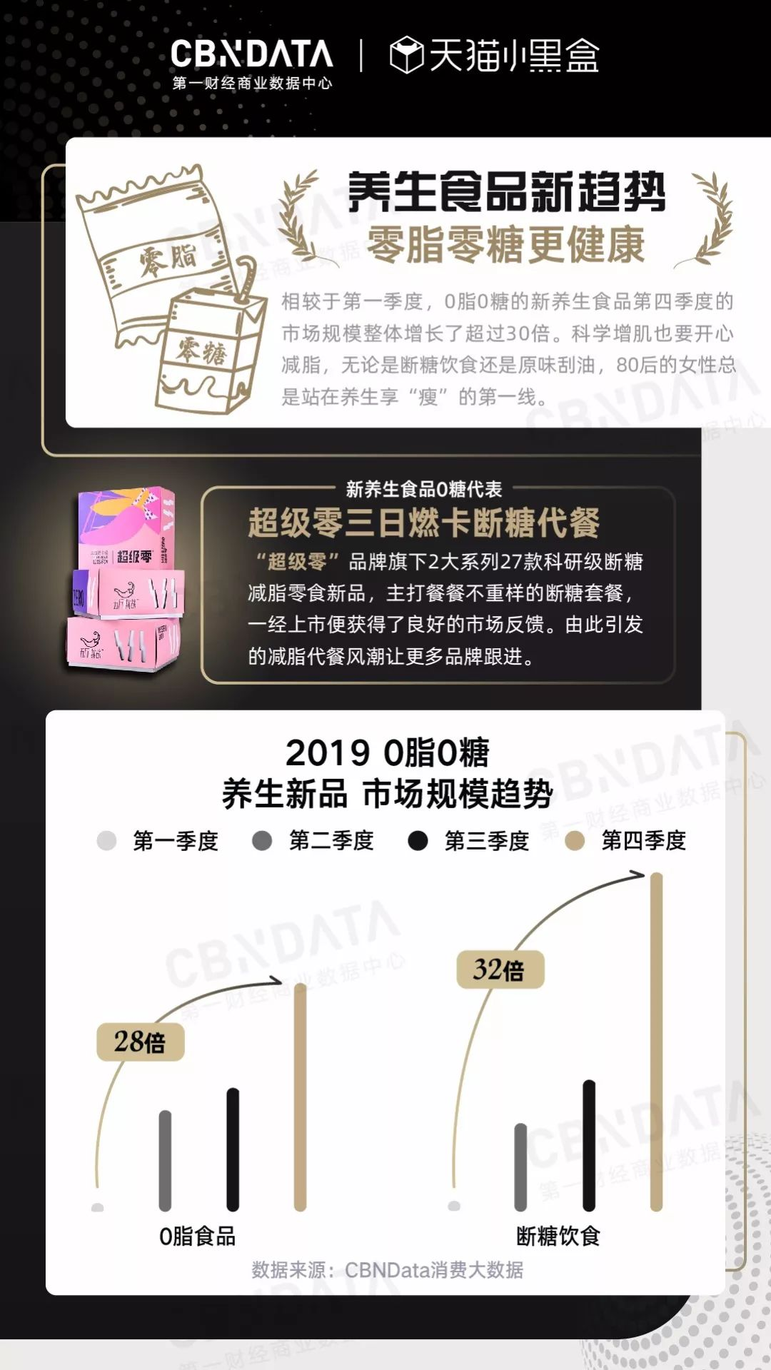 曾几何时,当听说有零食可以越吃越瘦,第一反应是“减肥药”?而今,还真出现了可以越吃越“瘦”,越吃越“美”的健康零食。根据CBNData x 天猫小黑盒《养生食品行业新品趋势白皮书》显示,通过控制饮食摄入来达到瘦身美体的0脂0糖新养生食品,第四季度市场规模较第一季度整体增长超过30倍。以超级零为例,其历时18个月研发的三日燃卡断糖代餐,是其中的代表新品。