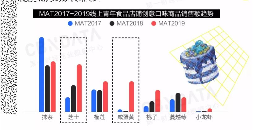 如CBNData x 淘宝《2019中国年轻创造力洞察报告》所示,近年来,线上青年美食店铺刮起创意风潮,贩售手作、创意食品的店铺比例逐年走高,从创意口味商品的销售规模来看,“抹茶口味”热度犹存,“芝士风味”增长稳健,而“咸蛋黄”则是近一年的创意风向标,涨势突出。