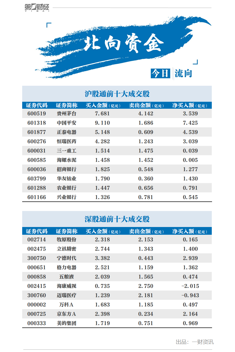 前十大成交股中,净买入额居前三的是中国平安、正泰电器、贵州茅台,分别获北向资金净买入7.43亿元、4.54亿元、3.54亿元。呈现净卖出的有两家公司海康威视、迈瑞医疗,净卖出额分别为2.02亿元、0.94亿元。
