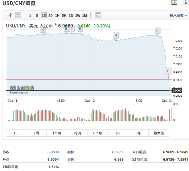 人民币兑美元中间价今日上调97点,报7.0156,上一交易日报7.0253。9时30分,在岸市场上,人民币对美元即期汇率开盘报6.9595,较前一交易日7.0333的收盘价大涨超过700个基点。